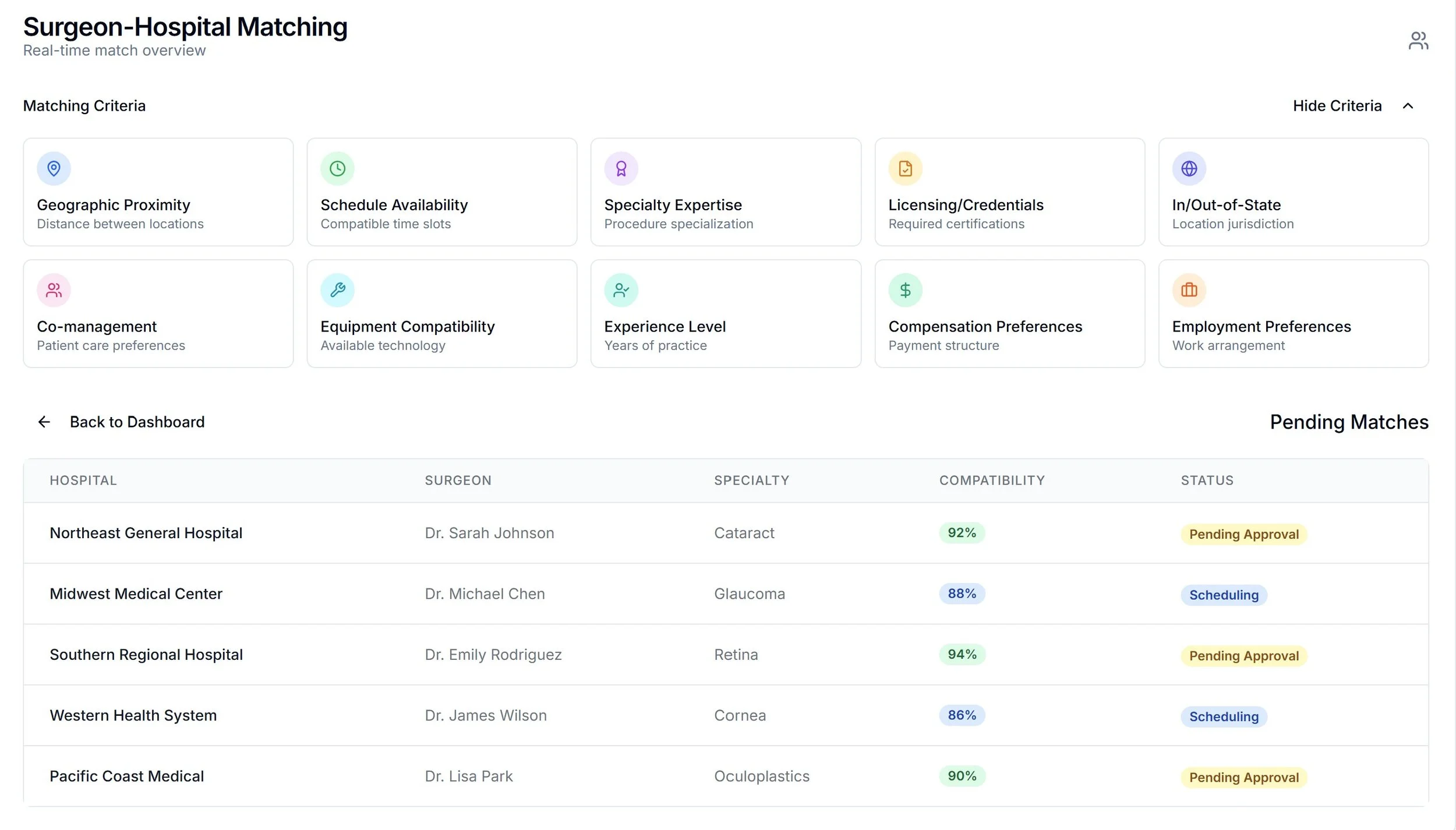 We’re a logistics platform that connects skilled surgeons with hospitals and clinics in need of specialty care. Built by and for surgeons who value both flexibility and continuity, Stratus offers a smarter way to practice—no quotas, no staffing agencies, no private equity strings attached. Just recurring placements that align with your values and fit your life.